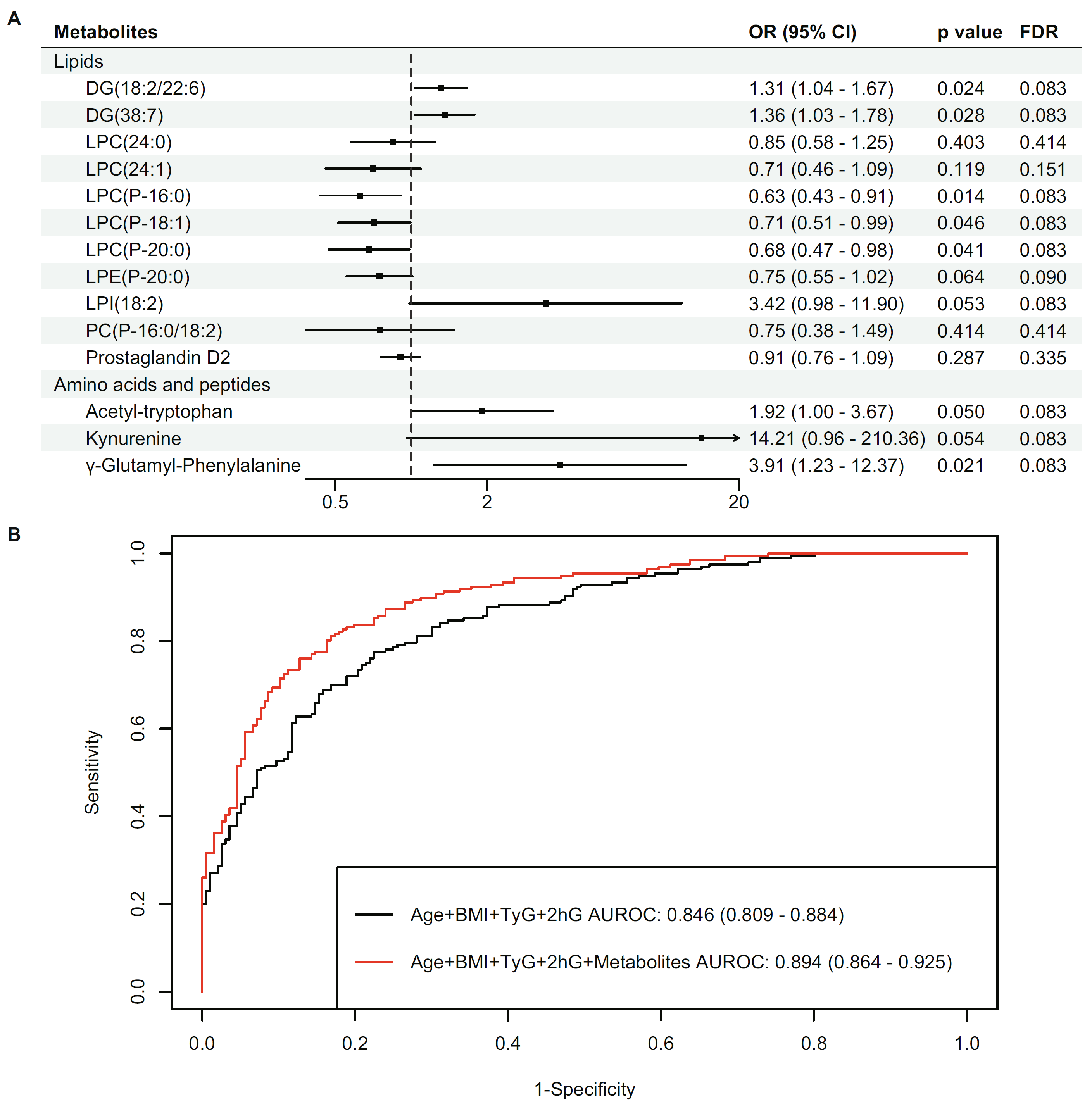 臨床風(fēng)險(xiǎn)因素顯示出中等的預(yù)測(cè)能力,平均交叉驗(yàn)證AUROC為0.846(年齡+BMI+TyG+2hG)(圖6B)。添加上述10種代謝產(chǎn)物顯著增強(qiáng)了模型性能,AUROC達(dá)到0.894(年齡+BMI+TyG+2hG+代謝產(chǎn)物)。這些結(jié)果表明,傳統(tǒng)臨床預(yù)測(cè)因素和代謝組學(xué)特征的組合等于或優(yōu)于已建立的預(yù)測(cè)模型。